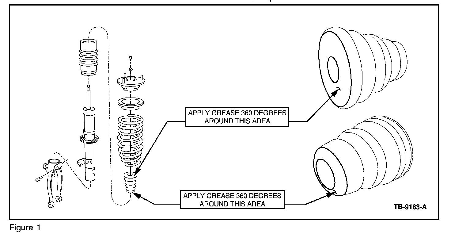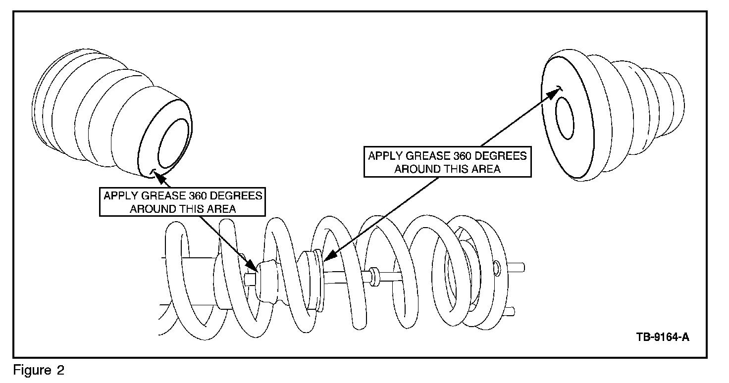 4. Apply Motorcraft(R) Silicone Brake Caliper Grease and Dielectric Compound 3600 around the upper and lower contact surfaces of the shock absorber piston bounce bumper. (Figures 1 - 2)