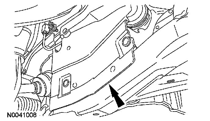 28. Position the LH front structure-to-subframe splash shield in place and install the 6 pin-type retainers.