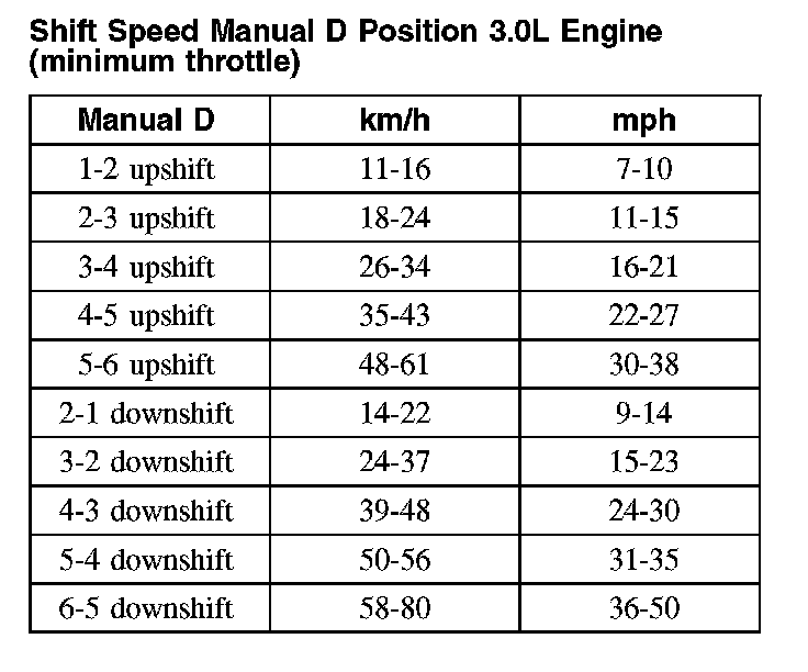 Shift Speed Manual D Position 3.0L Engine (Minimum Throttle):