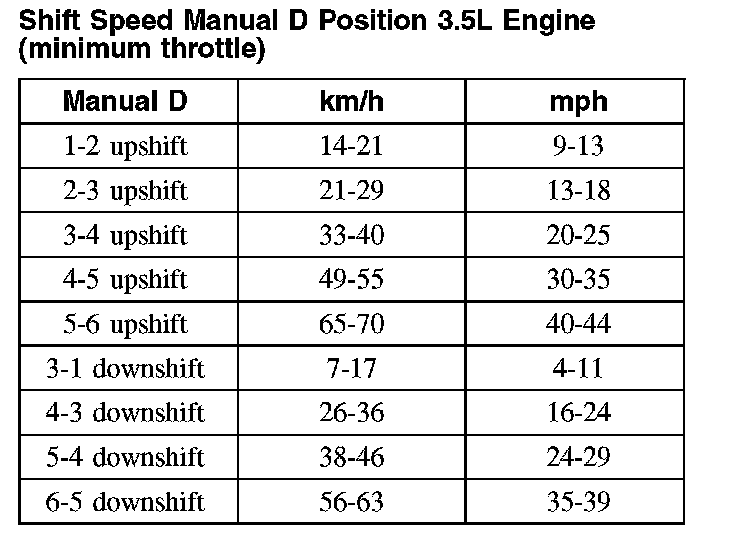 Shift Speed Manual D Position 3.5L Engine (Minimum Throttle):