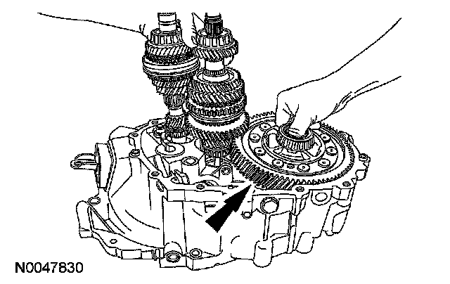 CAUTION: Whenever the transaxle has been disassembled, the bearing preload must be adjusted. The input shaft, output shaft and differential bearing preload can be adjusted by selecting shims to insert between the bearing races and the case on the case side.