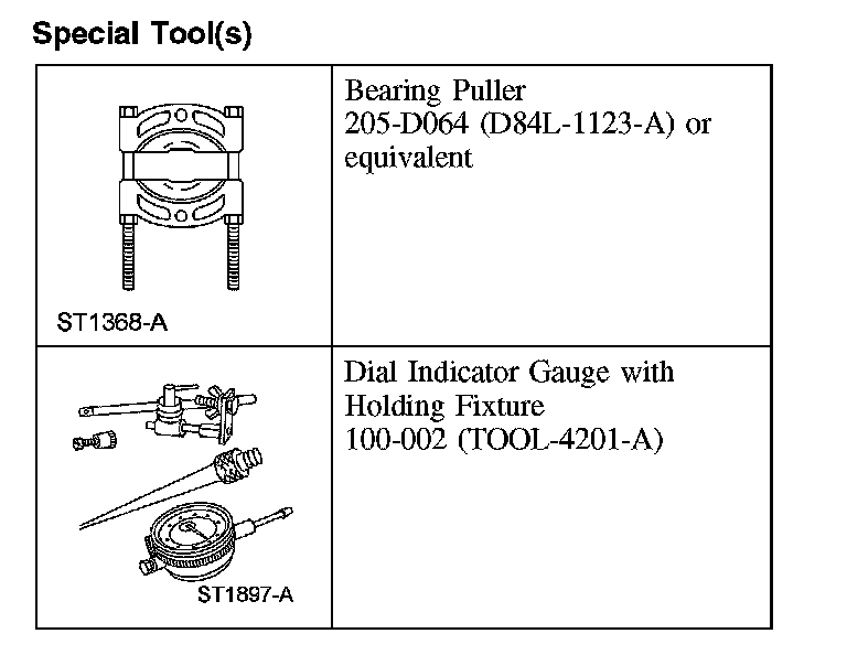 1. Measure the clearance between 1st gear and the differential drive gear. First gear endplay is 0.05-0.33 mm (0.002-0.013 inch).