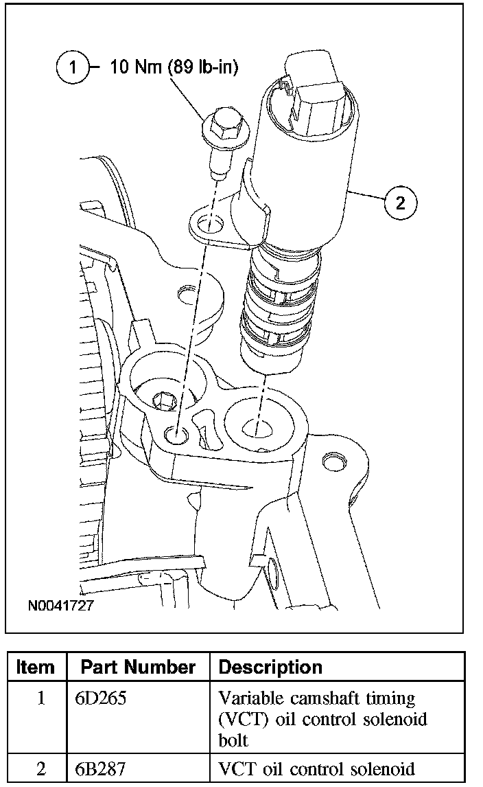 2. Remove the bolt and the variable camshaft timing (VCT) oil control solenoid.