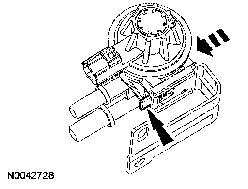 5. Depress the tab and remove the EVAP canister purge valve from the bracket.