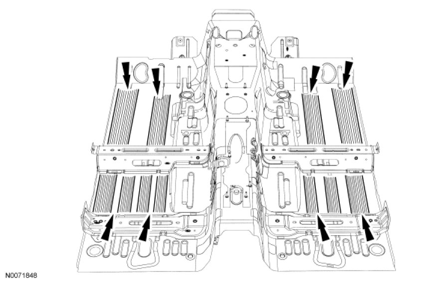 NOTE: To restore the vehicle to design intent, missing or damaged sound deadeners and insulators should be replaced with the correct service replacement component. Illustration indicates pumpable mastic material applied as indicated.