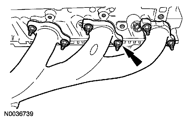 100. Position a new RH exhaust manifold gasket and the RH exhaust manifold. Install the 6 nuts.- Tighten to 23 Nm (17 ft. lbs.).