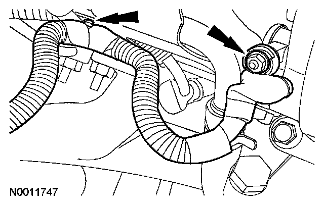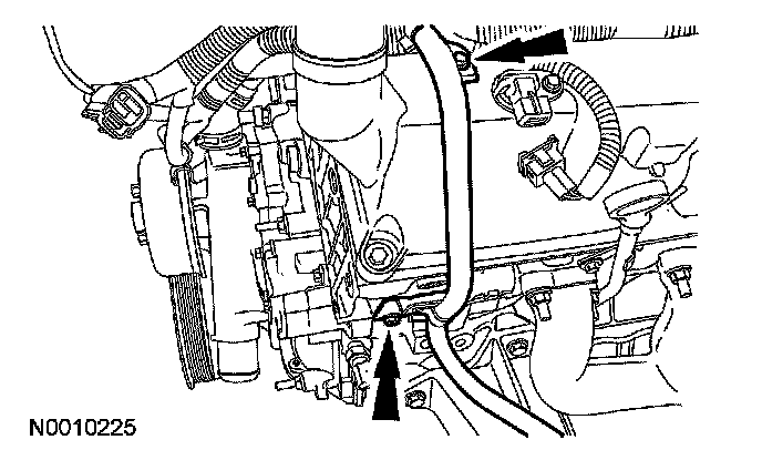 27. Remove the bolt and then disconnect the coolant bypass hose and the heater hose from the coolant pump.