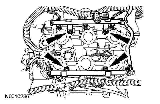 25. Remove the 4 bolts and then remove the fuel rail and injectors.