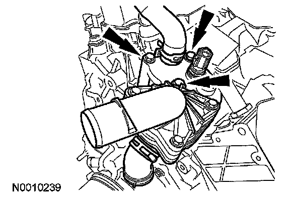 28. Remove the 3 bolts and then remove the thermostat housing, hoses and coolant tube.
