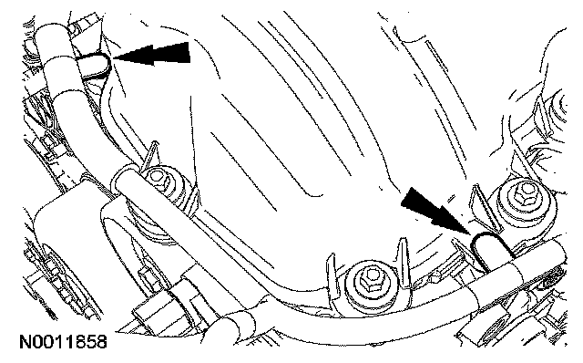 11. Disconnect the 2 engine wiring harness retainers from the LH valve cover studs.