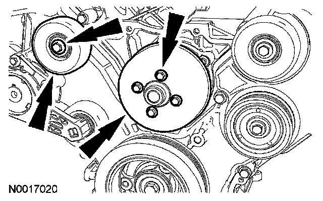 26. Remove the 5 bolts, the coolant pump pulley and the RH side accessory drive belt idler pulley.