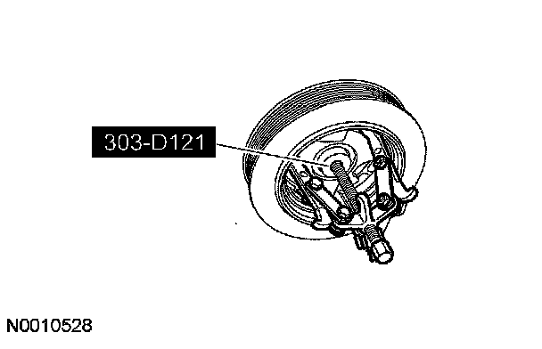 27. Remove and discard the crankshaft pulley bolt. Using the special tool, remove the crankshaft pulley.