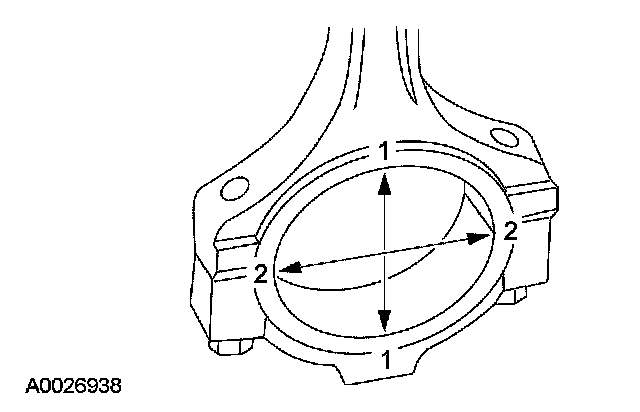 1. Tighten the bolts to specification, then measure the bore in 2 directions. The difference is the connecting rod bore out-of-round. Verify the out-of-round is within specification.