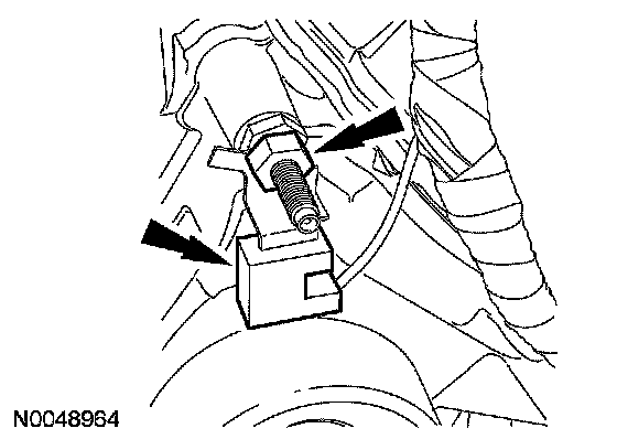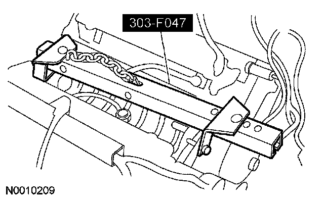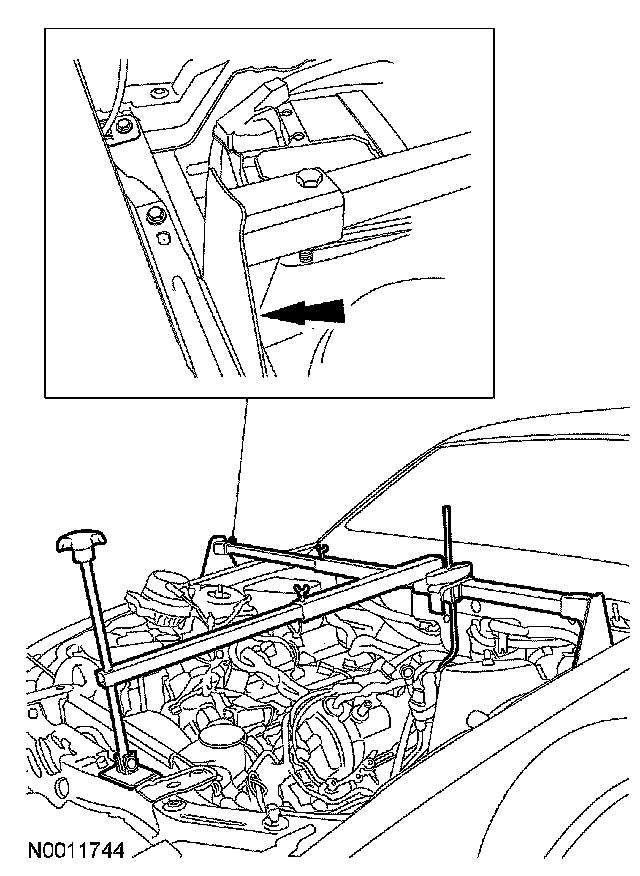 CAUTION: Do not position the legs of the special tool (3-bar engine support) on the fenders. Instead, the legs should be positioned on the body structure near the suspension strut tower.