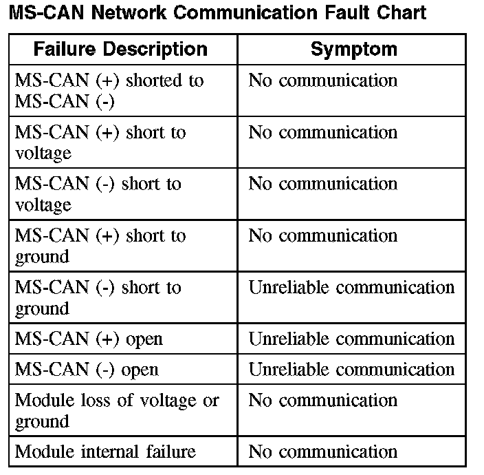 The fault chart describes the specific MS-CAN network failures and their resulting symptom.