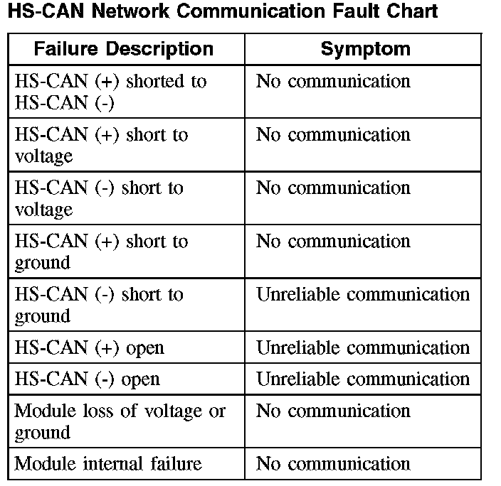 The fault chart describes the specific HS-CAN network failures and their resulting symptom.