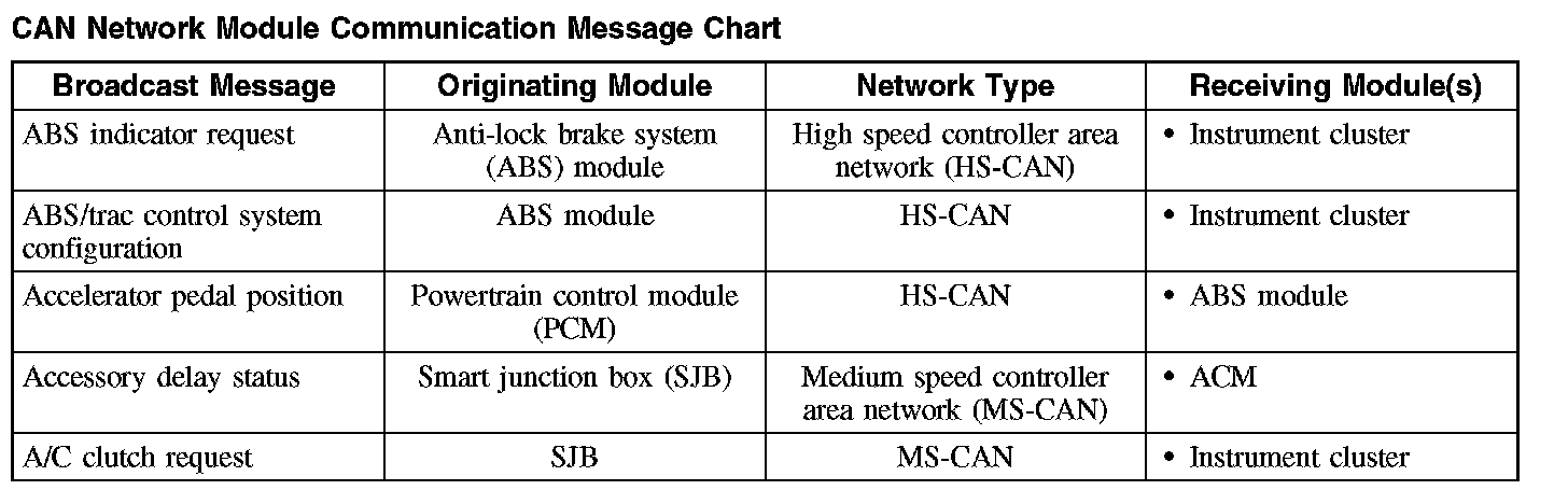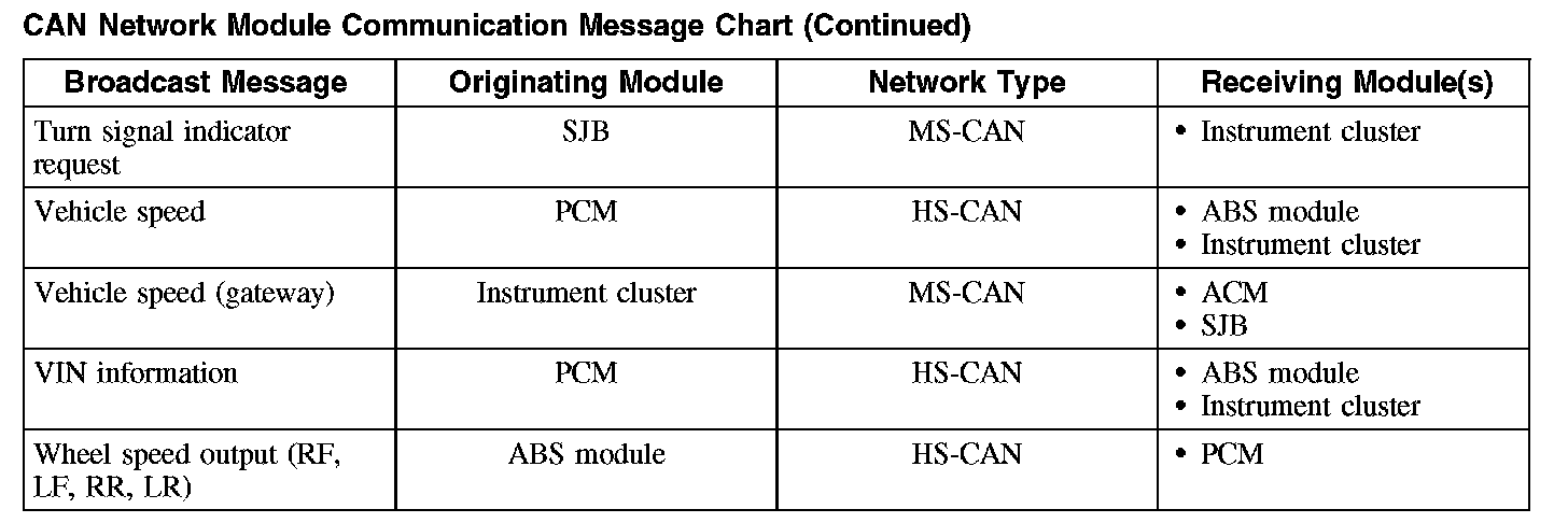 The HS-CAN network uses an unshielded twisted pair cable of data (+) and data (-) circuits. The data (+) and the data (-) circuits are each regulated to approximately 2.5 volts during neutral or rested network traffic. As bus messages are sent on the data (+) circuit, voltage is increased by approximately 1.0 volt. Inversely, the data (-) circuit is reduced by approximately 1.0 volt when a bus message is sent. Multiple bus messages can be sent over the network CAN circuits allowing multiple modules to communicate with each other. The HS-CAN is a high speed communication network used for the instrument cluster, the powertrain control module (PCM) and the anti-lock brake system (ABS) module (if equipped) communications, and designed for real time information transfer and control. The HS-CAN network will not communicate while certain faults are present, but will operate with diminished performance with other faults present. The HS-CAN bus may remain operational when 1 of the 2 termination resistors are not present.