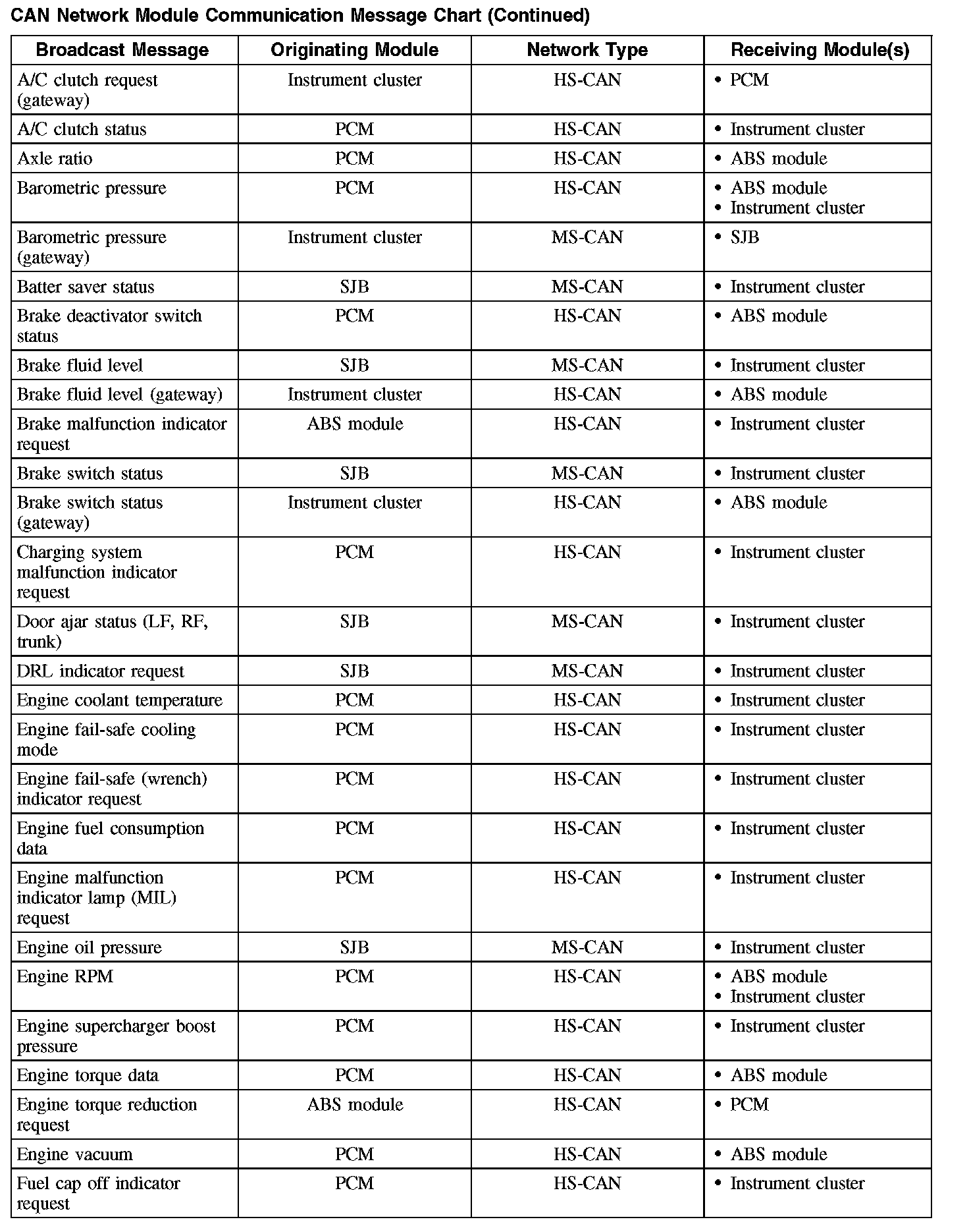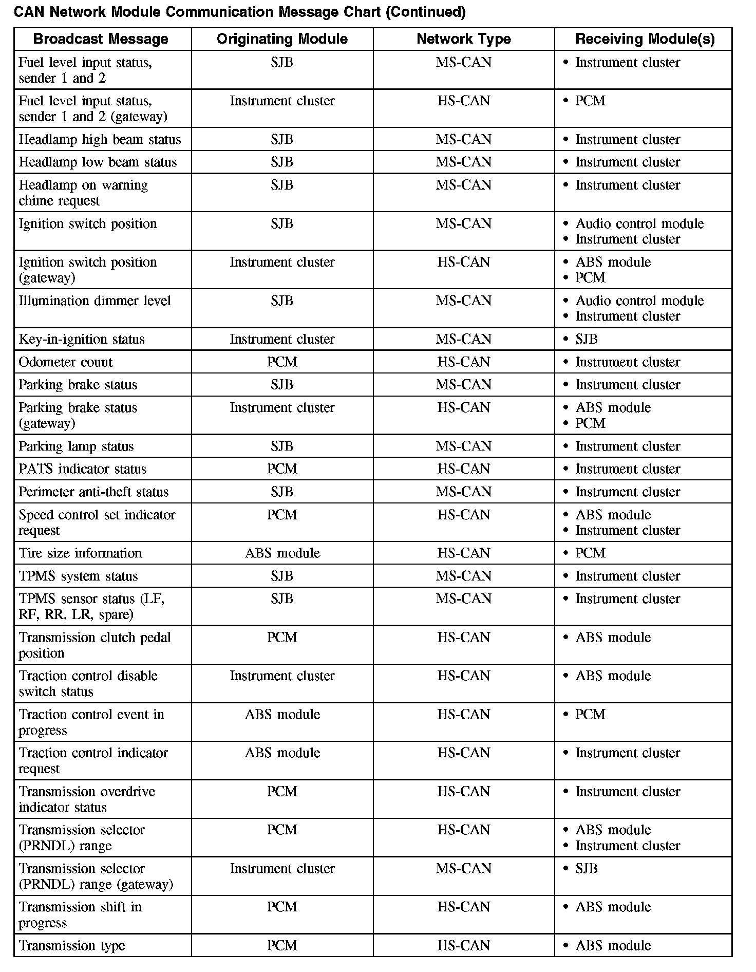 The chart describes the specific CAN network messages broadcast by each module, and the module(s) that receive the message.