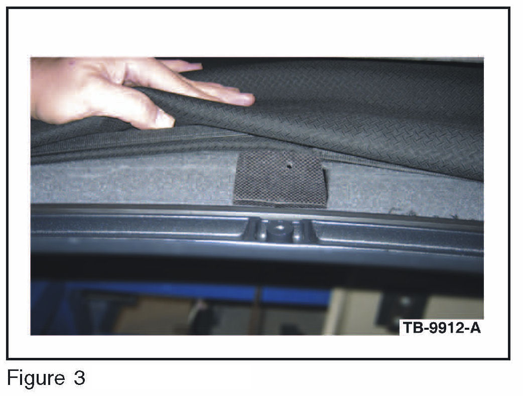 9. The front of the headliner attachment/u-channel should now be visible. The center of the headliner u-channel can be reattached to the groove in the number 1 bow. The headliner u-channel will need to be firmly seated into the groove on the number 1 bow using a small rubber mallet. (Figure 3)