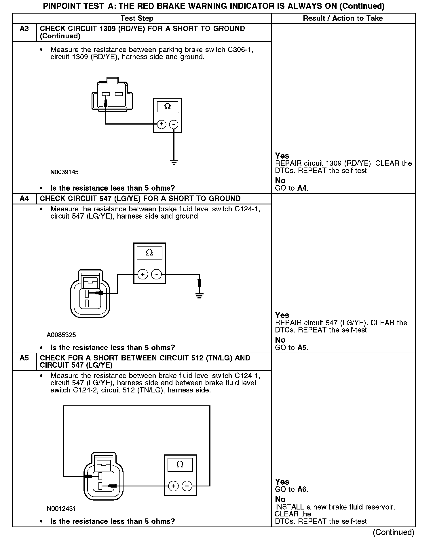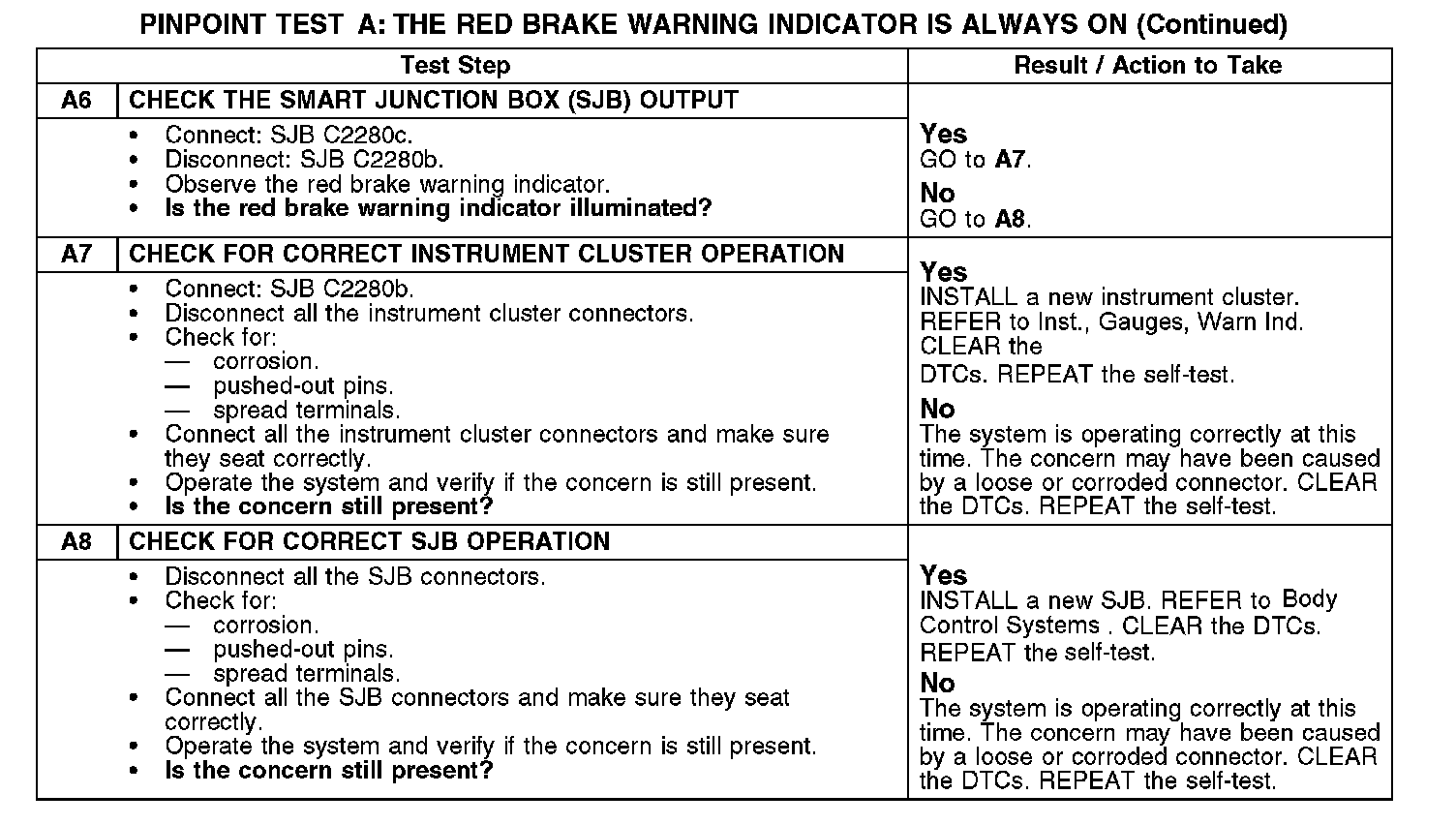 Test A: The Red Brake Warning Indicator is Always OnRefer to Vehicle/Diagrams, Instrument Cluster for schematic and connector information.