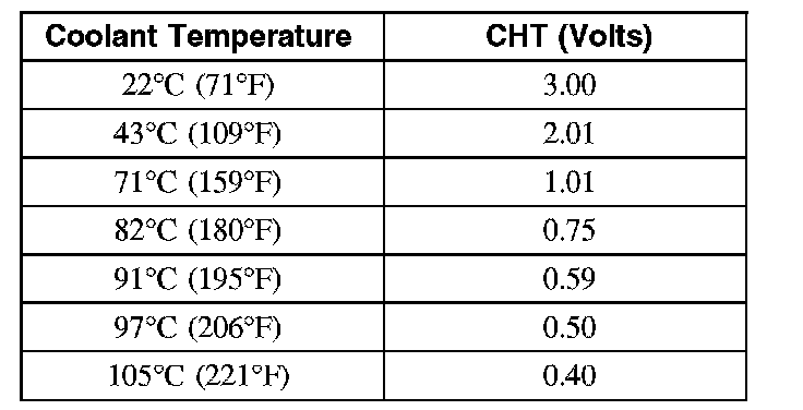 4. Start the engine and allow the engine to idle throughout this test. Allow the engine to run for 2 minutes, then record the ECT or CHT voltage. Record the ECT or CHT voltage every 60 seconds. When the ECT or CHT voltage trend changes direction or only changes slightly (0.03 volts or less) from the previous reading, record this as the thermostat opening voltage. Use the voltage and corresponding coolant temperature chart listed below for 4.6L (3V) engines only.