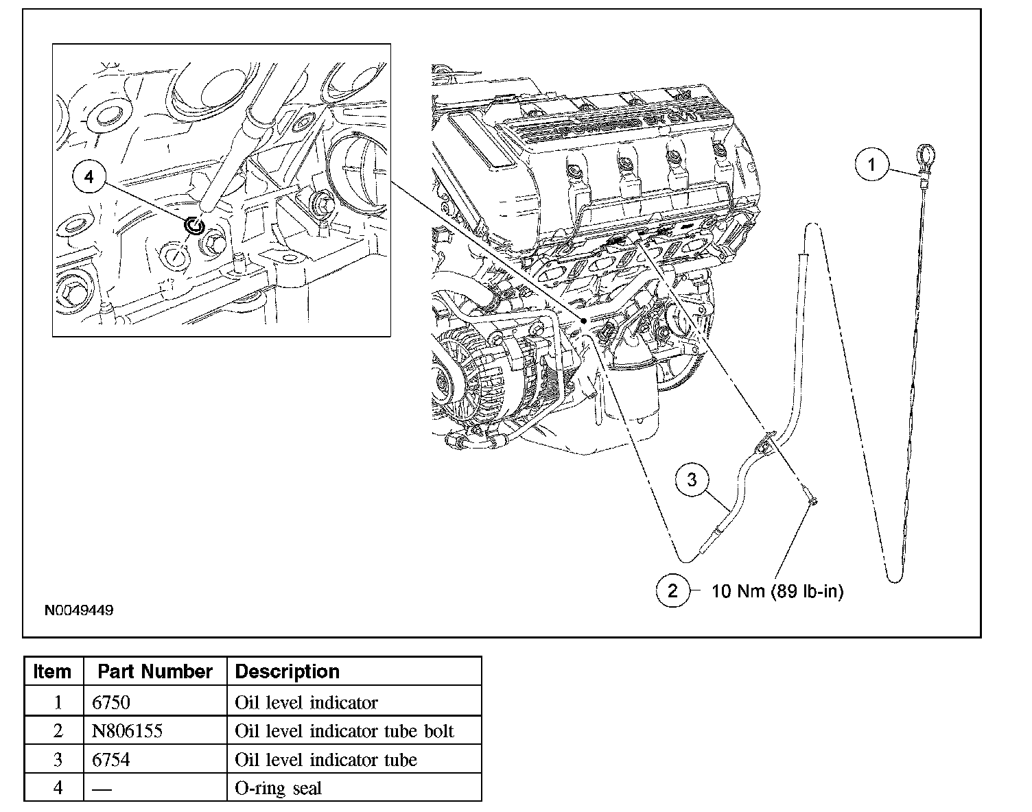 - Lubricate the new oil level indicator tube O-ring seal with clean engine oil prior to installation.
