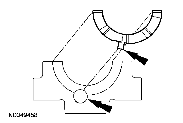 Install the lower crankshaft thrust washer to the back side of the No. 5 main bearing cap, with the tab aligned with the cutout in the main bearing cap.