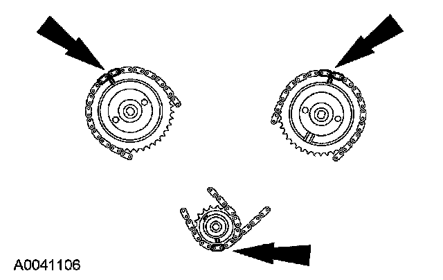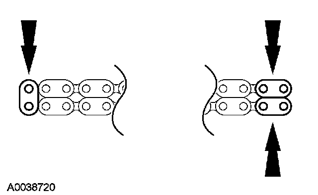 42. Position the RH (outer) timing chain on the crankshaft sprocket, aligning the colored link with the timing marks on the sprocket.