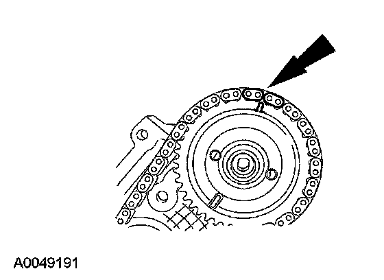 46. As a post-check, verify correct alignment of all timing marks. Make sure that the colored links are lined up with the marks on the crankshaft sprocket and the camshaft sprockets.