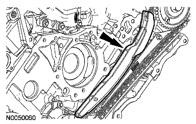36. Install the LH primary timing chain guide and the 2 bolts.