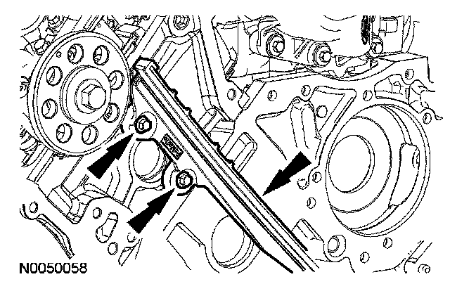 45. Install the RH primary timing chain tensioner and the 2 bolts.