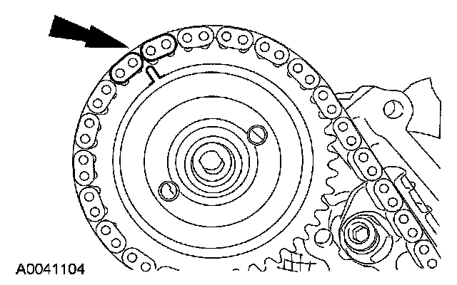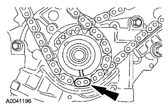 37. Position the LH (inner) timing chain onto the crankshaft sprocket, aligning the one colored link on the timing chain with the slot on the crankshaft sprocket.