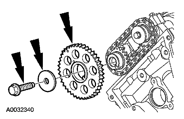 Install the camshaft sprocket, washer and bolt, and hand-tighten the bolt.