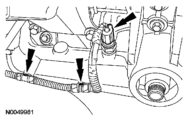 51. Disconnect the engine oil pressure (EOP) sensor electrical connector and the 2 wiring harness pin-type retainers.