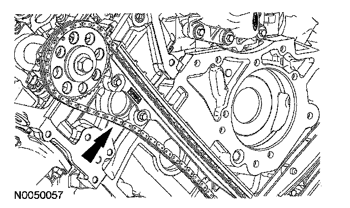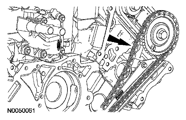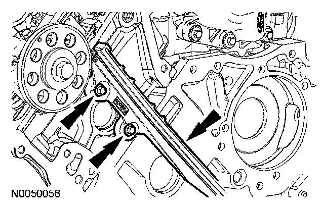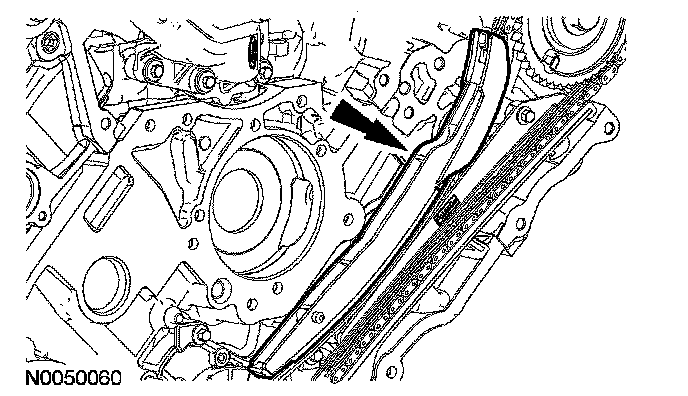 97. Remove the 2 bolts and the LH primary timing chain guide.