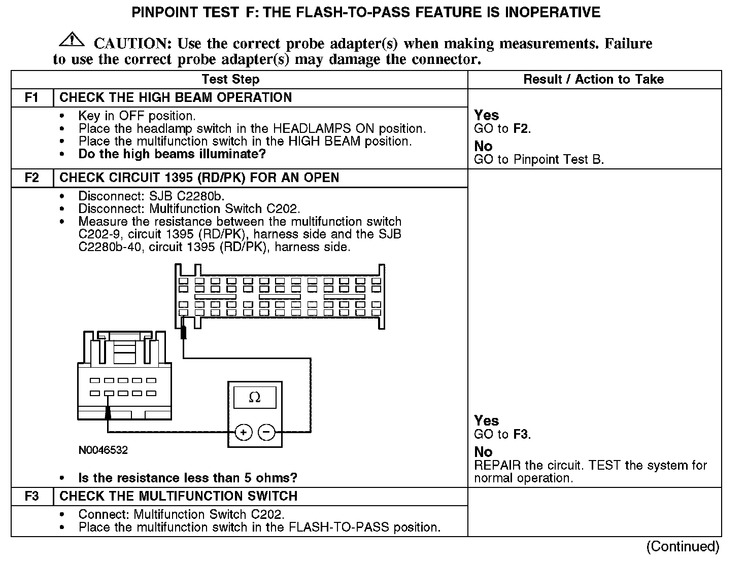 The smart junction box (SJB) sends a voltage reference signal to the multifunction switch through circuit 1395 (RD/PK). When the flash-to-pass feature is activated, the multifunction switch routes the signal back to the SJB. The SJB then provides voltage to the high beams.