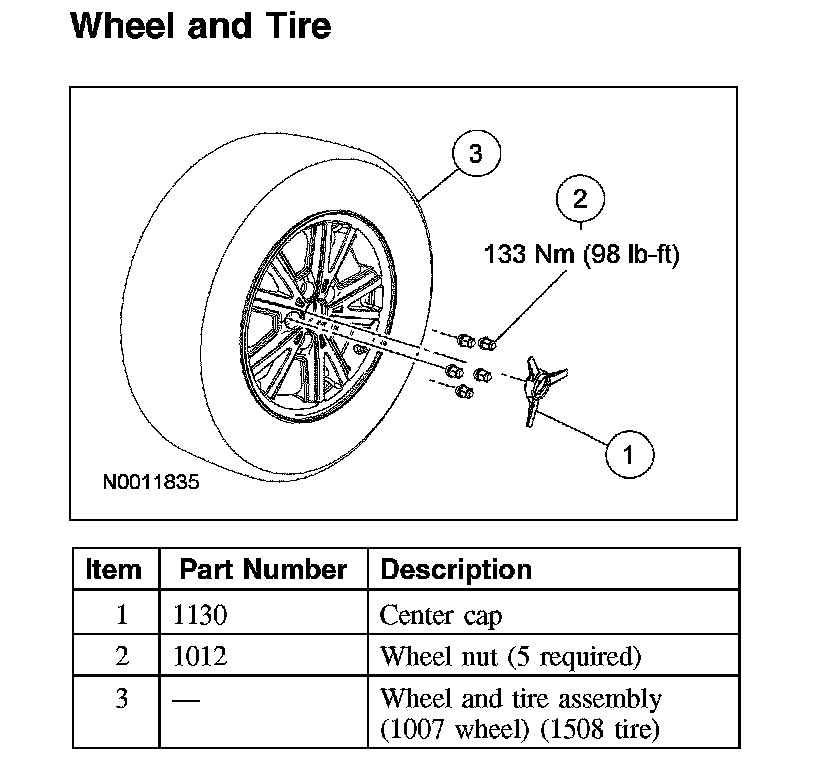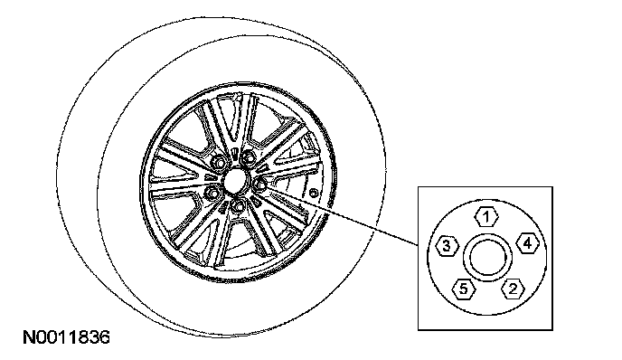 2. CAUTION: Failure to tighten the wheel nuts in the pattern indicated can result in high brake disc runout, which will speed up the development of brake roughness, shudder and vibration.
