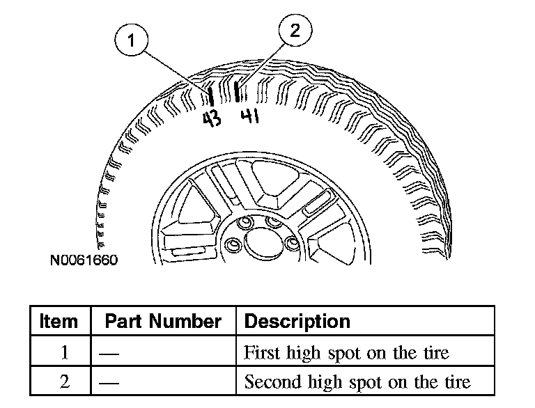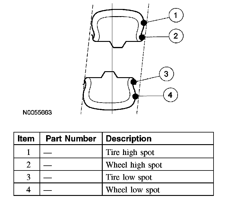 ^ NOTE: To be SURE that the tire is causing the high runout, you must have 2 runout measurements that are not within specification and the high spots must be in approximately the same location on the tire's sidewall. In other words, the high spot followed the tire when it was repositioned 180 degrees on the wheel.