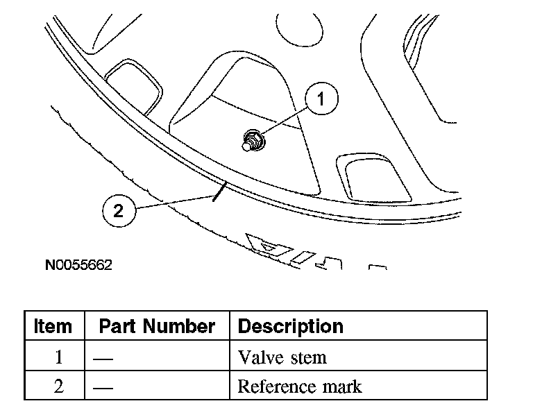 2. Position the wheel and tire assembly on a suitable tire machine and put a reference mark on the tire sidewall at the valve stem position.