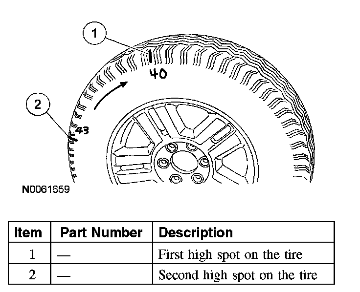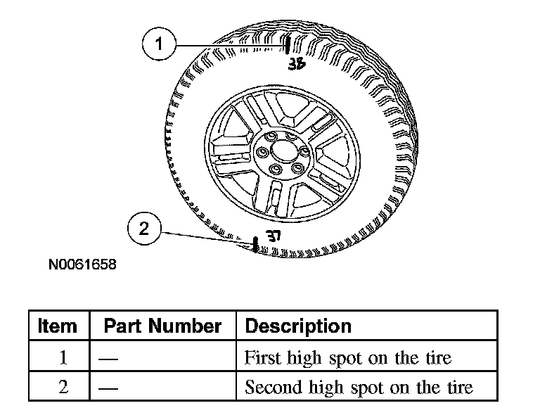 ^ If the runout reading of a wheel and tire assembly is not within 1.27 mm (0.050 inch), locate and mark the high spot and proceed to Match Mounting Step 1 to correct the concern.