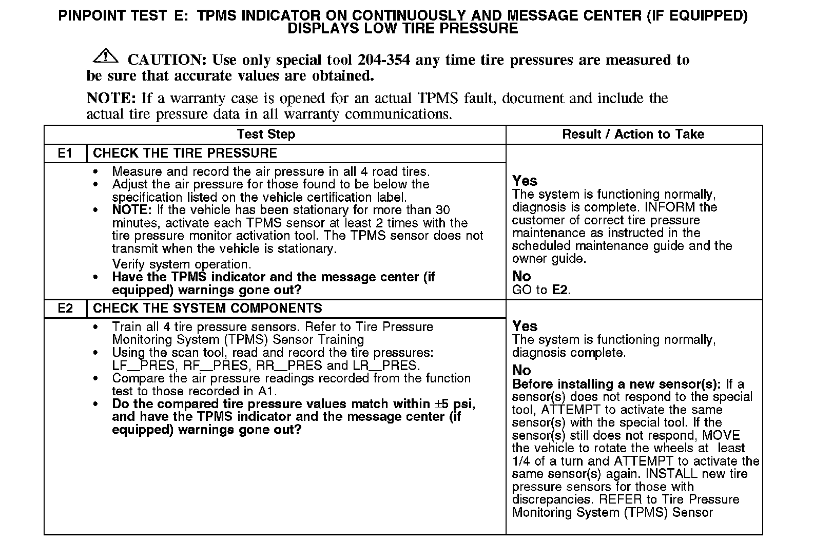 PINPOINT TEST E: TPMS INDICATOR ON CONTINUOUSLY AND MESSAGE CENTER (IF EQUIPPED) DISPLAYS LOW TIRE PRESSURENormal Operation
