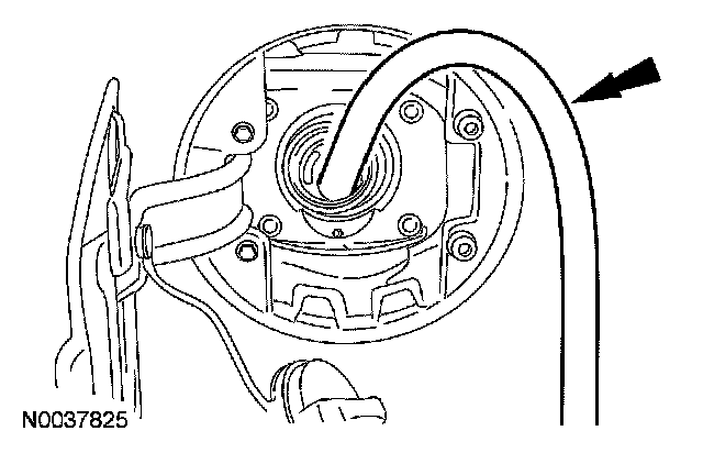 10. CAUTION: Some fuel may remain in the fuel tank filler pipe after draining. Carefully remove the fuel tank filler pipe assembly from the vehicle and drain any residual fuel into a suitable container.