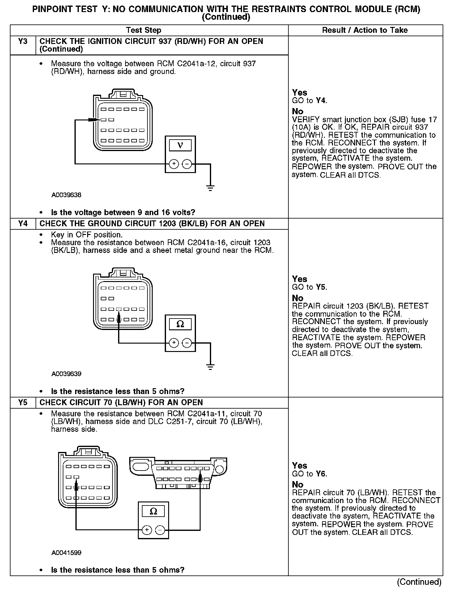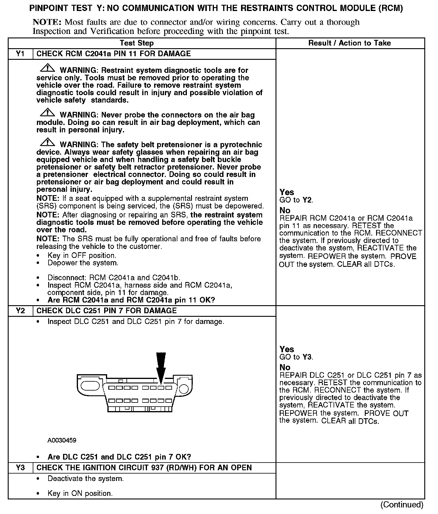 PINPOINT TEST Y: NO COMMUNICATION WITH THE RESTRAINTS CONTROL MODULE (RCM)Y1-Y3: