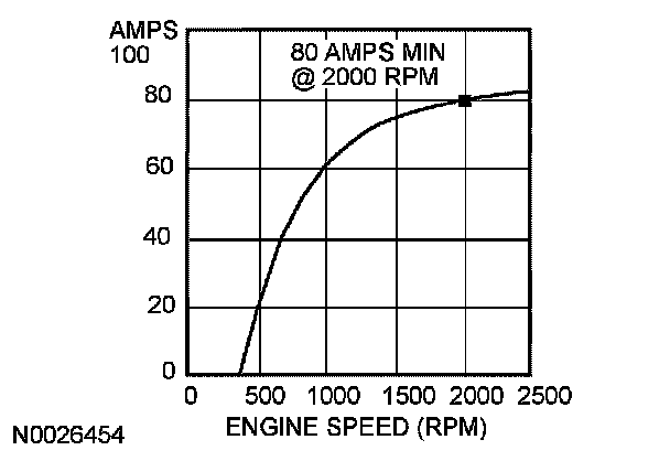4. With the engine running at approximately 2,000 rpm, adjust the tester load bank to determine the output of the generator. The generator output should be greater than the graph shown. If not, refer back to the pinpoint test or GO to Symptom Chart. Pinpoint Tests Symptom Related Diagnostic Procedures