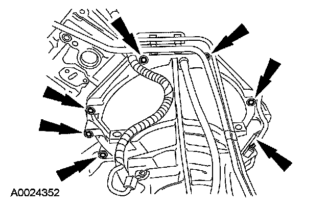 27. Remove the 6 engine-to-transmission retaining bolts and position the fuel line bracket aside.