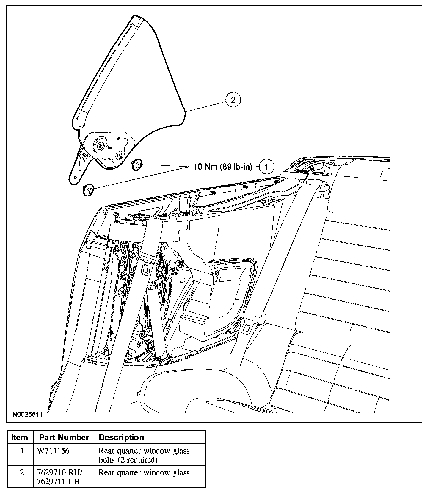 1. Install the rear quarter window glass and finger tighten the 2 bolts.