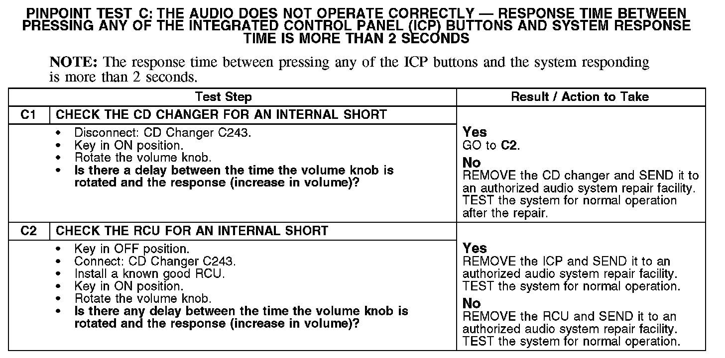 PINPOINT TEST C: THE AUDIO DOES NOT OPERATE CORRECTLY - RESPONSE TIME BETWEEN PRESSING ANY OF THE INTEGRATED CONTROL PANEL (ICP) BUTTONS AND SYSTEM RESPONSE TIME IS MORE THAN 2 SECONDSC1-C2: