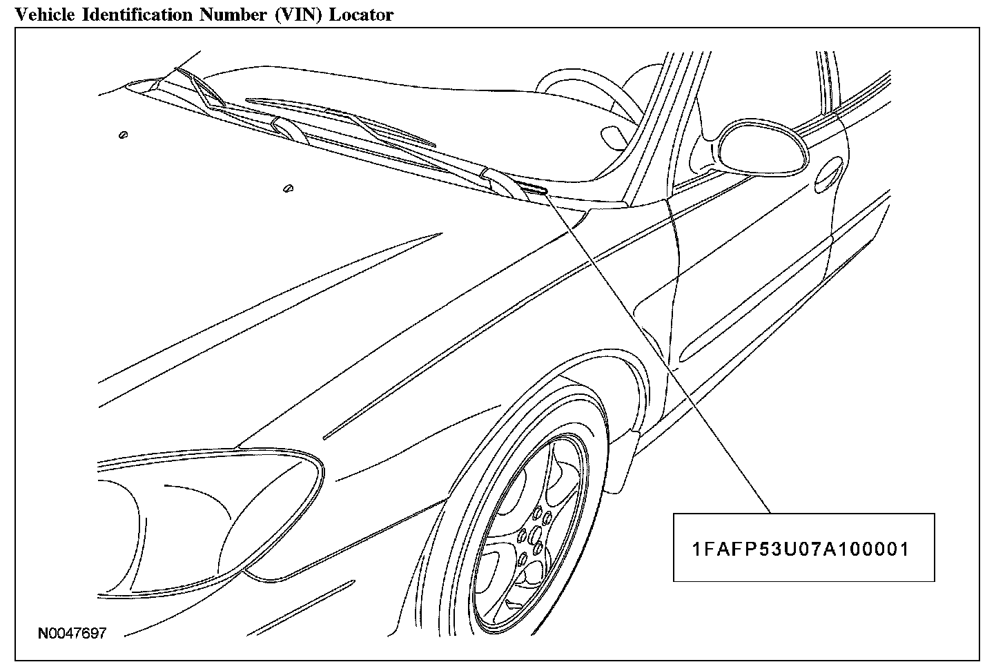 The vehicle identification number (VIN) is a 17-digit combination of letters and numbers. The VIN is stamped to a metal tab riveted to the instrument panel top, upper left of the dash. The VIN number is also found on the vehicle certification (VC) label.