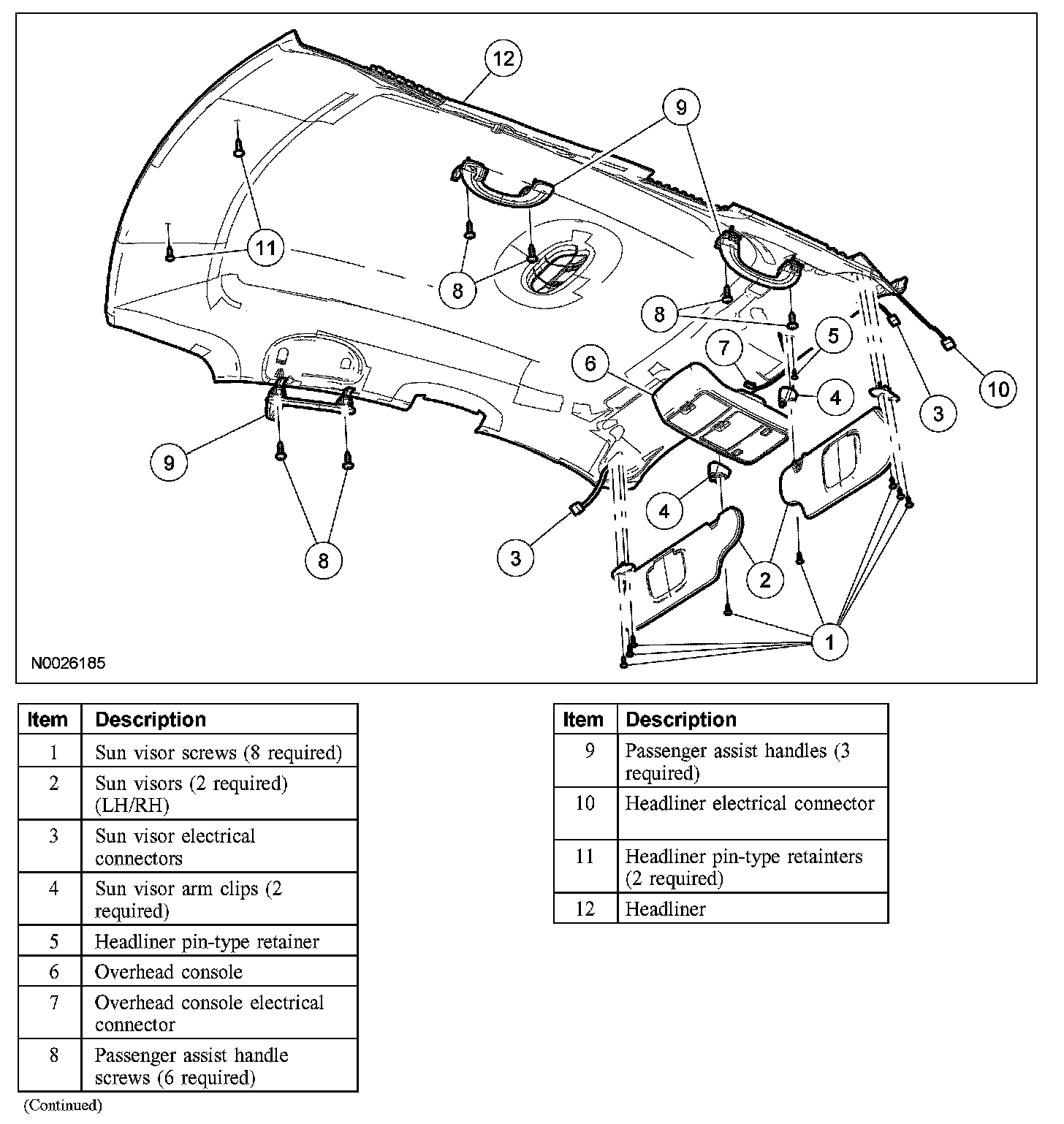 9. Remove the 6 screws and remove the LH and RH sun visors and sun visor clips.