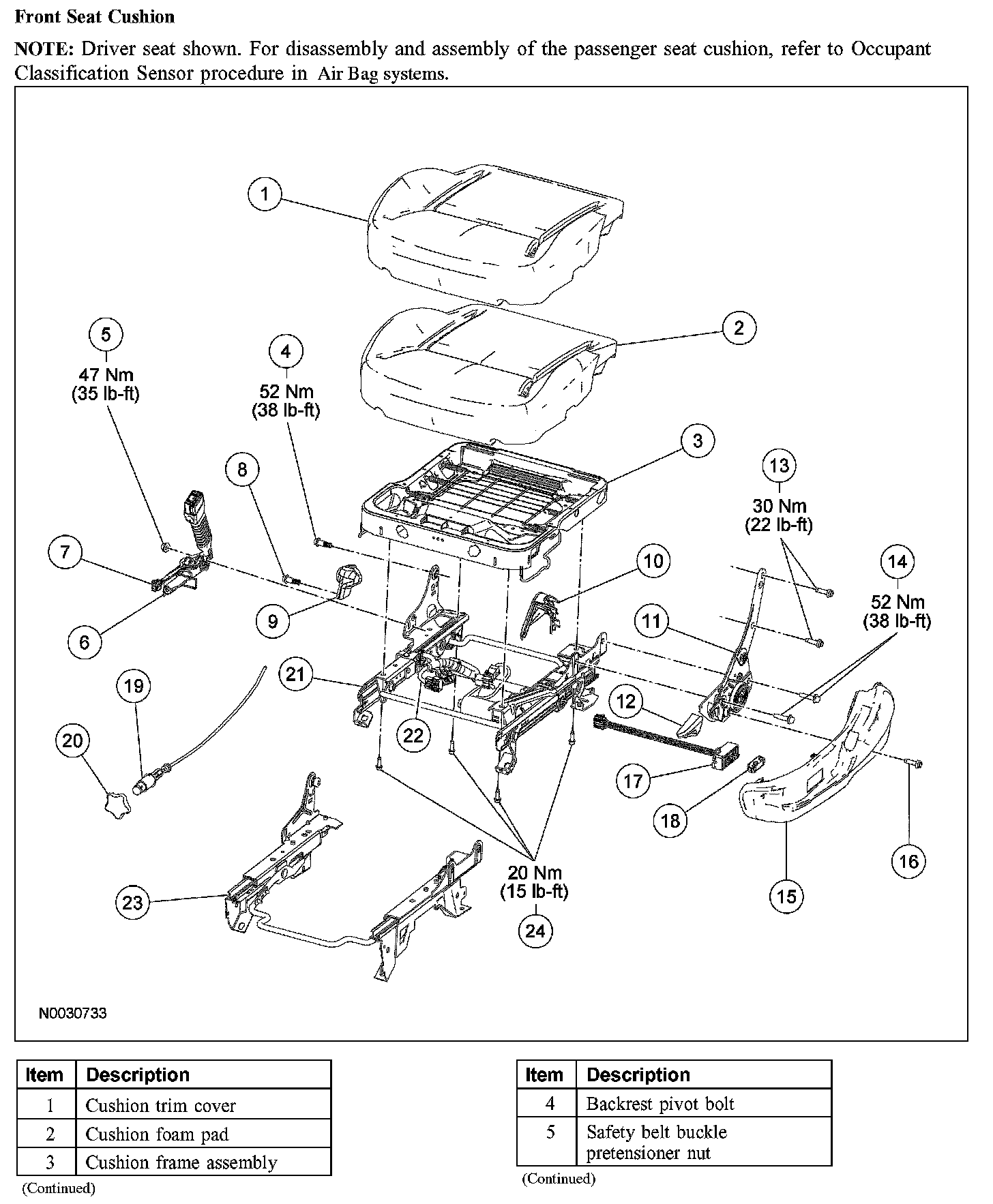 1. For disassembly and assembly of the passenger seat cushion, refer to the occupant classification sensor (OCS) procedure in Air Bag systems.